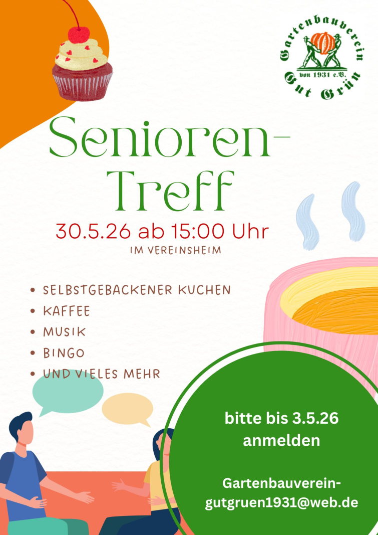 Wir möchten dieses Jahr in gemütlicher Atmosphäre mit Musik bei Kaffee und selbstgebackenen Kuchen auf die Bedürfnisse und Wünsche unserer älteren Mitglieder eingehen und eure Vorstellungen und Ideen für ein leichteres Leben im Alter in unserem Gartenverein anregen.Unser Festausschuss wird hier federführend alle Dinge dazu koordinieren. Bitte meldet euch zu Absprachen, Hilfeangebote etc. jeglicher Art per E-Mail wie folgt: