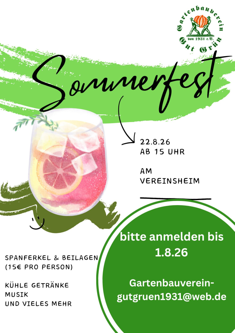 Unser Sommerfest findet am 22.8.26 statt. Alle sind herzlich eingeladen. Wir freuen uns auf ein gemütliches Beisammensein mit vielen Überraschungen. Ein detaillierter Aushang dazu erfolgt demnächst. Für das leibliche Wohl,Getränke und musikalische Begleitung ist gesorgt :-) Unser Festausschuss wird hier federführend alle Dinge dazu koordinieren.Bitte meldet euch zu Absprachen, Hilfeangebote etc. jeglicher Art per E-Mail wie folgt: